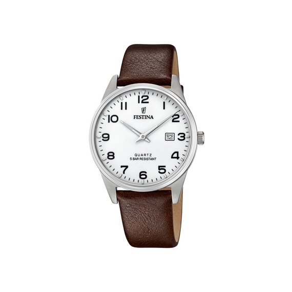 Tyylikäs ja klassinen Festinan miesten rannekello nahkarannekkeella. Festinalla on vuosisadan mittainen kokemus teknologian hyödyntämisestä, mikä näkyy laadukkaassa ja urheilullisessa kellomallistossa. Kaikki kellot ovat vesitiiviitä. Kelloilla on kahden vuoden takuu ja ne toimitetaan Festinan alkuperäisessä laatikossa.