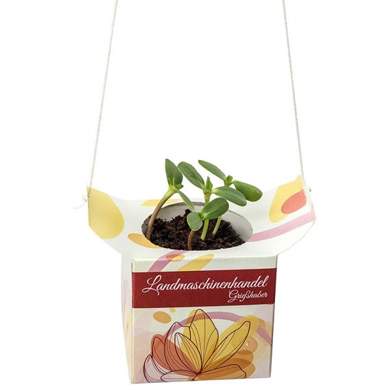 Ripustettava istutuskuutio sopii katseenvangitsijaksi kotiin tai toimistolle tarjoten loistavan mainosmahdollisuuden. Pakkauksen sisällä on vedenpitävä pahvikuppi, joka toimii pienenä kukkaruukkuna. Pakkaus sisältää ripustukseen tarkoitettavan narun. Valittavissa olevat siemenet: basilika, kuusi, chili, neliapila, yrttiseos, kehäkukka, kesäkukkasekoitus, päivänkakkara, tuoksuapila, auringonkukka, timjami ja lemmikki. Koko 6,2 x 6,2 x 12,4 cm. Paino 24 g. Hinnat sisältävät digipainatuksen aloituskuluineen.