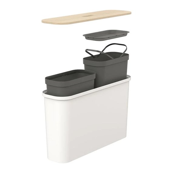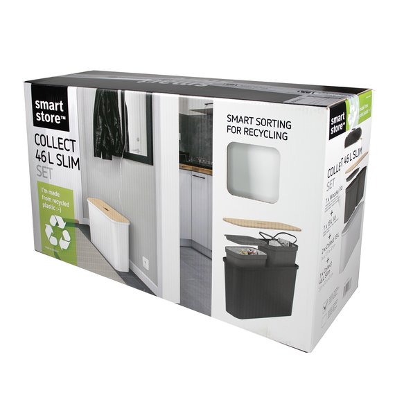 Pohjoismaista muotoilua edustava kestävä säilytysratkaisu arjen tarpeisiin. Modulaarinen konsepti tekee lajittelusta ja kierrättämisestä helppoa ja vaivatonta. Collect 46 L Slim on suunniteltu erityisesti ahtaisiin tiloihin, kuten sisäänkäynteihin ja eteisiin. Jätteet erotellaan helposti toisistaan kahden 13 L sisäosan avulla. Kaunis puinen kansi viimeistelee tuotteen. Valmistettu lujasta ja pitkäaikaisesta kierrätysmuovista. Mitat 21,5 x 72,2 x 42 cm.