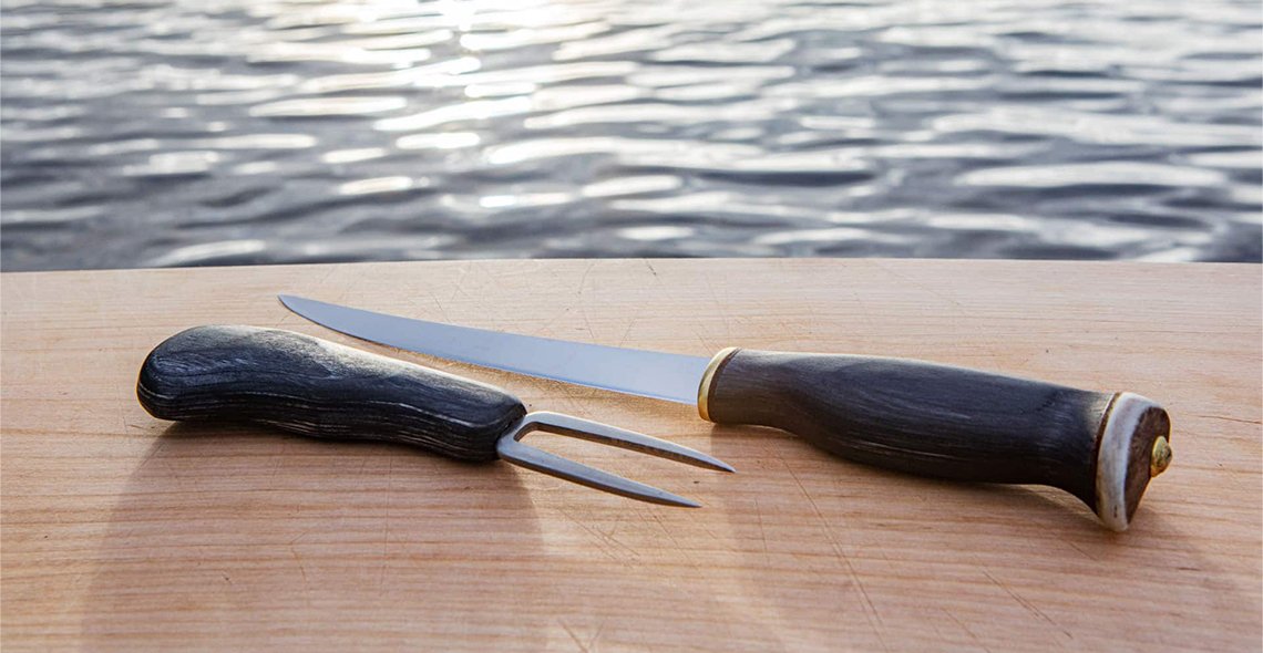 Kotimainen, Lapissa käsityönä valmistettu setti. Filettiveitsen terä on ruostumatonta terästä ja sen pituus on 16 cm. Kahva on mustaa visakoivua ja sen päässä on uniikki poronsarvesta valmistettu yksityiskohta. Kalapiikin terät ruostumatonta terästä ja kahva mustaa visakoivua. Setti sisältää ikkunallisen lahjapakkauksen, jonka mitat ovat 34 x 11 x 5 cm.