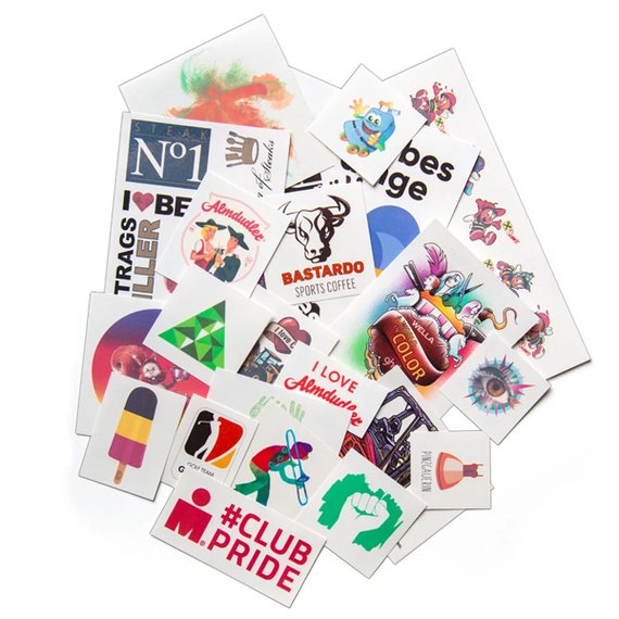 Tilaa tapahtumiin ja messuille oman yrityksesi näköinen hittituote! Siirtokuvatatuoinnit ovat vegaanisia ja pysyvät iholla 2-6 päivää aktiivisuudesta riippuen.