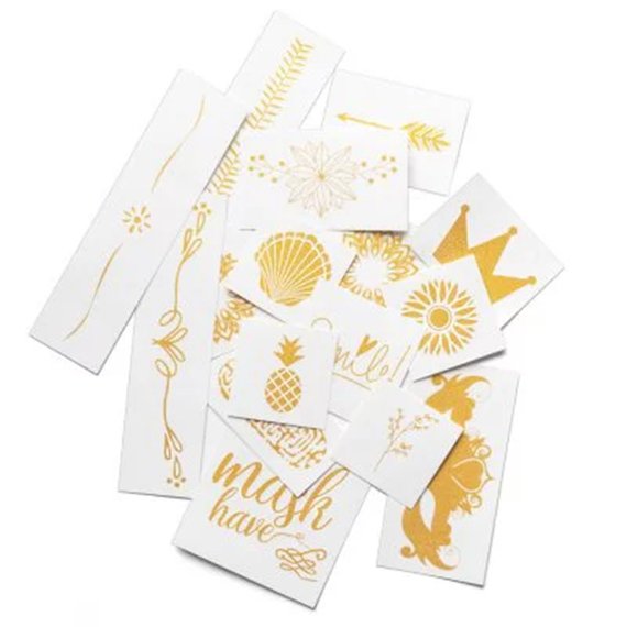 Koristele vartalosi kultaisilla siirtokuvatatuoinneilla! Siirtokuvatatuoinnit ovat vegaanisia ja pysyvät iholla 2-6 päivää aktiivisuudesta riippuen.