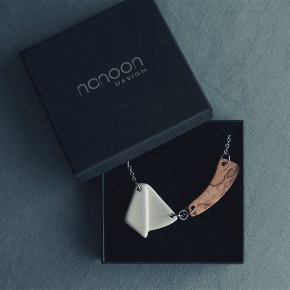 Korut pakattu mustaan Nanoon Design logolliseen rasiaan. Valmistettu Suomessa.