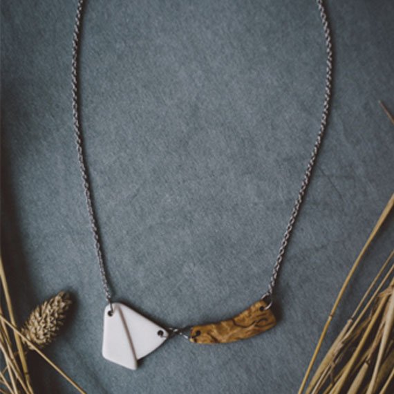 Erottuva kaulakoru, joka leikkiin epäsymmetrialla ja -tasapainolla kuin vaaka. Hiotussa posliiniosiossa keskellä pieni porrastus. Korussa yhdistyy sileäksi hiottu, lasittamaton posliini ja luonnonkaunis, suomalainen visakoivu. Posliini- ja puuosat on valmistettu alusta loppuun käsityönä, minkä ansiosta korun jokainen osa on oma yksilönsä. Myös puuosion satunnaisesti vaihteleva kuviopinta on kuin sormenjälki, joka tekee jokaisesta korusta uniikin. Korujen puuosien sävyissä tai kuviopinnoissa saattaa esiintyä vaihtelua, joka kuuluu materiaalin luonteeseen. Kaulakorun pituus 55 cm.