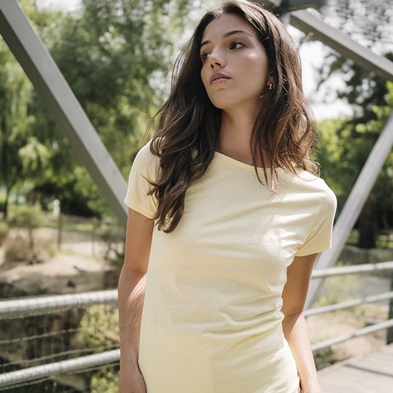 Naisten t-paita on valmistettu 100 % kammatusta puuvillasta. T-paidassa ribbineulottu kaulus, kaksoisommellut hihat ja helma. Entsyymikäsitelty. 150 g/m2. Mitat S-XXL.