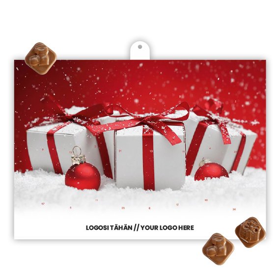 Kalenterin 24 luukussa on täytteenä herkullista maitosuklaata. Kalenteri on valmistettu FSC-sertifioidusta kartongista ja se on täysin muoviton ja 100 % kierrätettävä. Koko n. 207 x 146 x 12 mm. Paino n. 48 g. Myynti 50 kpl erissä.