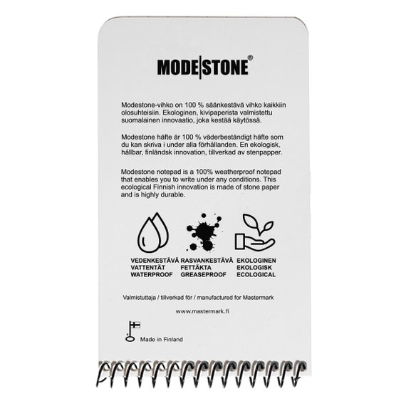 Mistä materiaalista vihon voisi valmistaa? Parhaaksi vaihtoehdoksi osoittautui kalkkikaivoksen sivutuotteista valmistettu kivipaperi. Modestone-vihko kestää veden ja rasvan, se ei repeä, tuholaiset eivät syö sitä, sitä on mukava käyttää, ja paperihaavoistakaan ei tarvitse kantaa huolta. Jos kynää ei ole saatavilla, vihkoon voi kirjoittaa vaikka avaimella. Vihko on erinomainen vaativien olosuhteiden apuväline esimerkiksi eräretkelle tai veneeseen.
