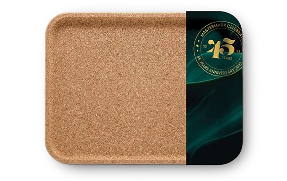 Suorakaiteen mallinen tarjotin omalla designilla. Tarjotin on valmistettu koivuviilusta ja päällystetty ympäristöystävällisellä korkilla, jotta tarjoiltavat eivät liu’u päältä pois. Mitat 36 x 28 cm. Hinta sisältää digipainatuksen tarjottimen etupuolelle.