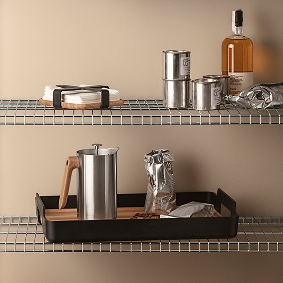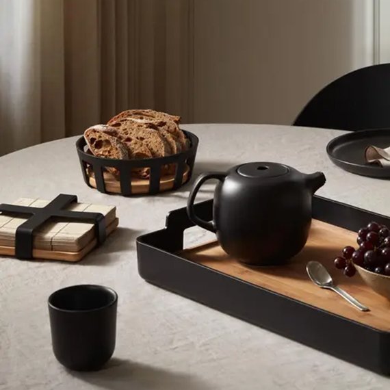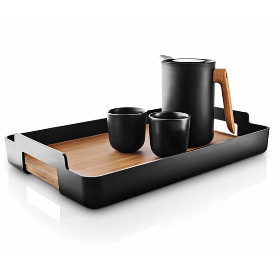 Eva Solon upealla ja reilunkokoisella tarjottimella kannat vakaasti kupit ja kannut. Korkeat reunat estävät tavaroita liukumasta tarjottimen päältä ja sivuilla olevista kahvoista saa hyvän otteen. Tarjotin on helppo puhdistaa kostealla liinalla. Bambua suositellaan öljyämään säännöllisesti. Materiaali: muovi, FSC-sertifioitu bambu. Koko 50 x 35 cm, korkeus 6 cm.