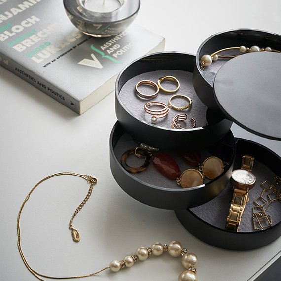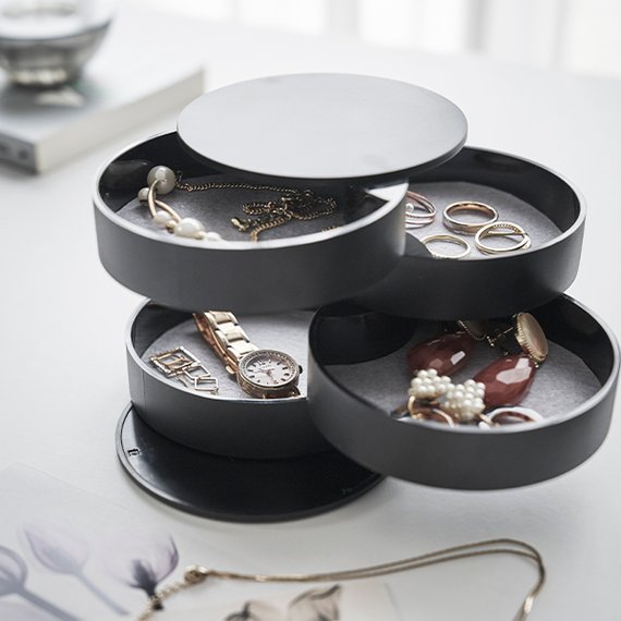 Minimalistisessa Tower-korulippaassa on neljä kerrosta, joissa korut ja muut pikkutavarat on vaivaton pitää hyvässä järjestyksessa. Kannen ansiosta myös ylin kerros on suojassa pölyltä. Suunniteltu Japanissa.