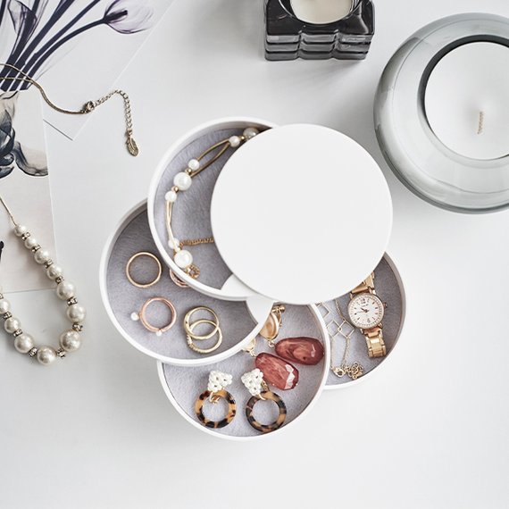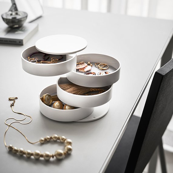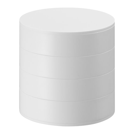 Minimalistisessa Tower-korulippaassa on neljä kerrosta, joissa korut ja muut pikkutavarat on vaivaton pitää hyvässä järjestyksessä. Kannen ansiosta myös ylin kerros on suojassa pölyltä. Suunniteltu Japanissa.