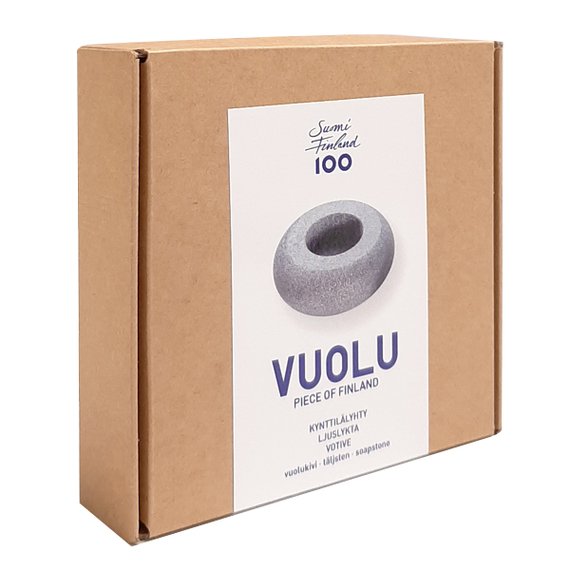 Vuolu-tuikkukynttilänjalassa yhdistyvät tuli ja ikiaikainen vuolukivi suomalaisesta maaperästä. Tuikkukynttilänjalka on täysin kotimainen tuote materiaalista suunnitteluun ja valmistukseen. Halkaisija 86 mm, korkeus 30 mm.