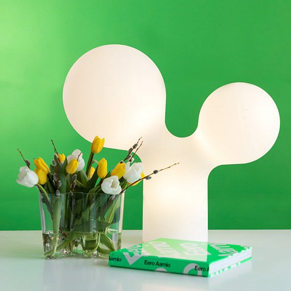 Polyeteenistä valmistettu näyttävä pöytävalaisin on suomalaista designia parhaillaan. Valaisin on varustettu energiatehokkailla, vaihdettavilla LED-valonlähteillä, ja sen kupu on valmistettu täysin kierrätettävästä materiaalista. Suunniteltu ja valmisteltu Suomessa. Suunnittelija: Eero Aarnio. Mitat: 580 x 530 x 280 mm. Paino 3 kg.