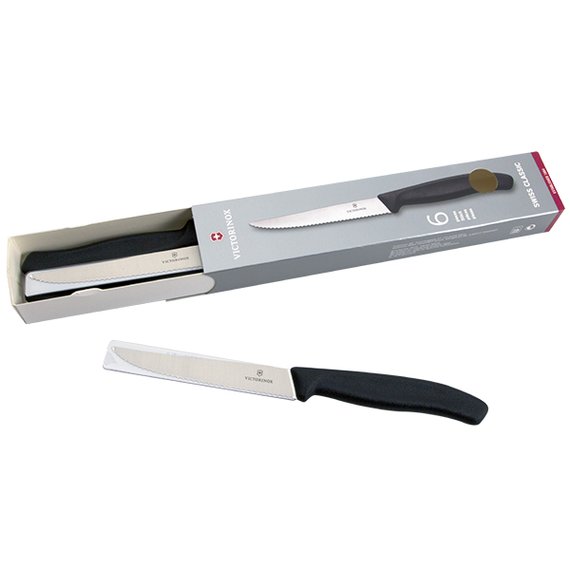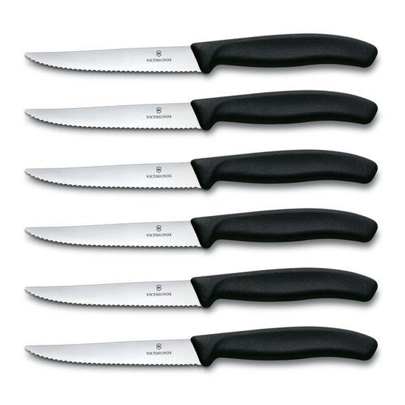 Kunnon pihviateriaa ei kannata pilata kehnoilla veitsillä. Hanki hyvän pihvin seuraksi laadukkaat Victorinoxin pihviveitset. Lahjapakkauksessa on kuusi teräväkärkistä, ruostumattomasta teräksestä valmistettua pihviveistä. Veitsissä on liukumaton kahvamateriaali ja muotoiltu kädensija. Terän pituus 11 cm.