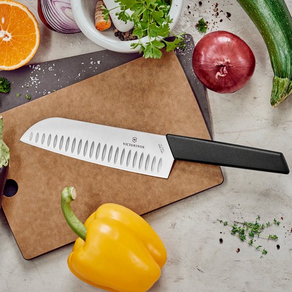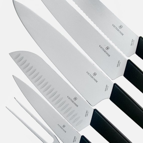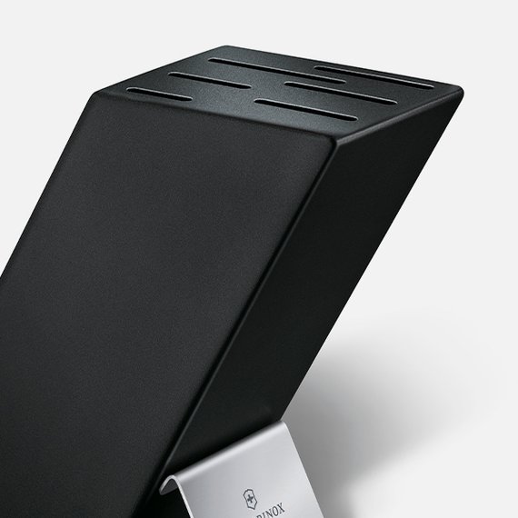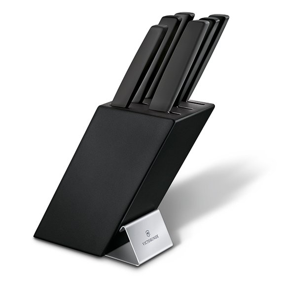 Kuusiosainen Victorinoxin tyylikäs musta veitsitukki. Sisältää viisi veistä ja haarukan: yleisveitsi 15 cm, santoku-veitsi kaarretulla reunalla 17 cm, lihaveitsi extra leveällä terällä 20 cm, lihaveitsi 22 cm, paistihaarukka 15 cm ja leipäveitsi 22 cm. Kaikissa veitsissä on ruostumattomat, kulutusta kestävät terät sekä synteettiset kahvat.