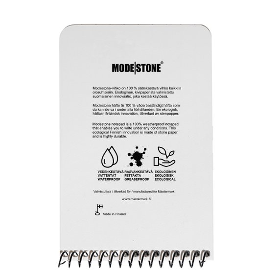 Mistä materiaalista vihon voisi valmistaa? Parhaaksi vaihtoehdoksi osoittautui kalkkikaivoksen sivutuotteista valmistettu kivipaperi. Modestone-vihko kestää veden ja rasvan, se ei repeä, tuholaiset eivät syö sitä, sitä on mukava käyttää, eikä paperihaavoistakaan tarvitse kantaa huolta. Jos kynää ei ole saatavilla, vihkoon voi kirjoittaa vaikka avaimella. Vihko on erinomainen vaativien olosuhteiden apuväline esimerkiksi eräretkelle tai veneeseen. Kivipaperin valmistus säästää merkittävästi luontoa verrattuna tavallisen paperin valmistukseen. Kun valmistetaan tonni kivipaperia tavallisen paperin sijaan, 20 puuta säästyy kaatamiselta, vesistöt säästyvät yli 28 000 litralta jätevettä ja ilmasto 107 kilolta päästöjä. Käytännön tarpeesta syntynyt ekologinen tuote onkin suomalaisinnovaatio parhaimmillaan.