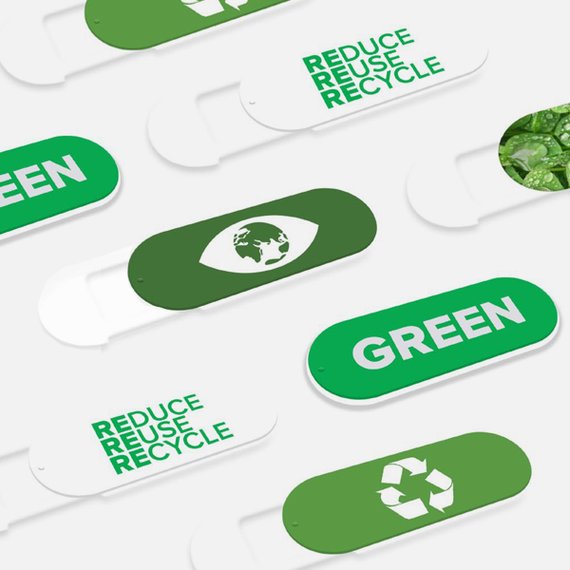 Webbikameran suojus suojaa yksityisyyden ja pitää logon näkyvillä päivittäin. Tämä ekosuojus sopii ohuen muotonsa vuoksi sekä kannettaviin tietokoneisiin että tabletteihin ja puhelimiin. Se sulkeutuu ja avautuu helposti paikoillaan. Suojus on valmistettu 100% maatuvasta PLA-biomuovista. Sitä on tilattavissa kahdessa eri koossa: 32 x 12 mm tai 25,5 x 10,5 mm. Suojus kiinnittyy paikoilleen laadukkaan kaksipuolisen teipin avulla, joka ei jätä jälkiä laitteisiin. Vakioväreinä musta ja valkoinen. Suojus toimitetaan tuotepaketissa, jonka mukana on täysin kustomoitavissa oleva infokortti, kokoa 85 x 55 mm. Infokortti on valmistettu FSC-sertifioidusta paperista.